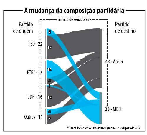 Para formar novas agremiações, o AI-2 exigia reunir pelo menos 120 deputados e 20 senadores. Como na época o Senado tinha 66 membros (eram 22 os estados), matematicamente poderiam existir três partidos. Mas desde o início a ideia era que fossem apenas dois: um reunindo o bloco parlamentar de apoio ao governo e outro com o que restasse de “oposição consentida” à ditadura.