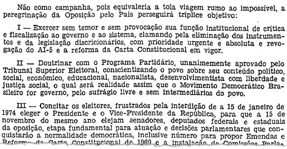 — O que deseja o MDB é levar ao público, ao povo, a todas as camadas da opinião pública, como poderá fazer a Arena, a sua palavra para esclarecer as razões que justificaram a indicação de candidatos à Presidência e à Vice-Presidência da República.