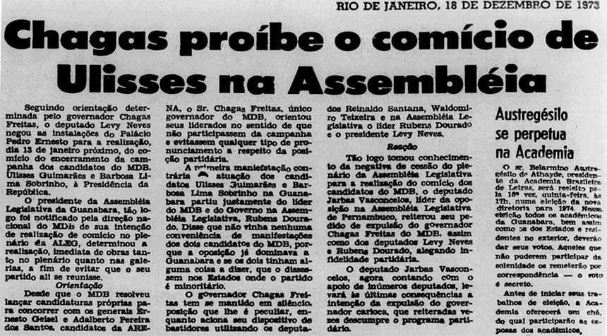 — Não é o candidato que vai recorrer o país. É o anticandidato, para denunciar a antieleição imposta pela anticonstituição que homizia [encobre] o AI-5 [a norma mais repressiva da ditadura], submete o Legislativo e o Judiciário ao Executivo, possibilita prisões desamparadas pelo habeas corpus e condenações sem defesa, profana a indevassabilidade dos lares e das empresas pela escuta clandestina e torna inaudíveis as vozes discordantes, porque ensurdecem a nação pela censura à imprensa, ao rádio, à televisão, ao teatro e ao cinema.