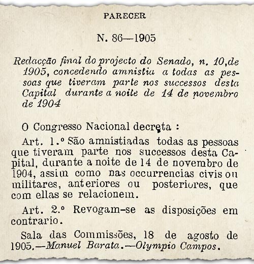 — O que resta da anistia? — perguntou Ruy Barbosa, indignado, meses após a Revolta da Chibata, respondendo ele próprio em seguida. — Os cadáveres da Ilha da Cobras, os cadáveres do Satélite e os cadáveres [do município amazônico] de Santo Antônio do Rio Madeira.