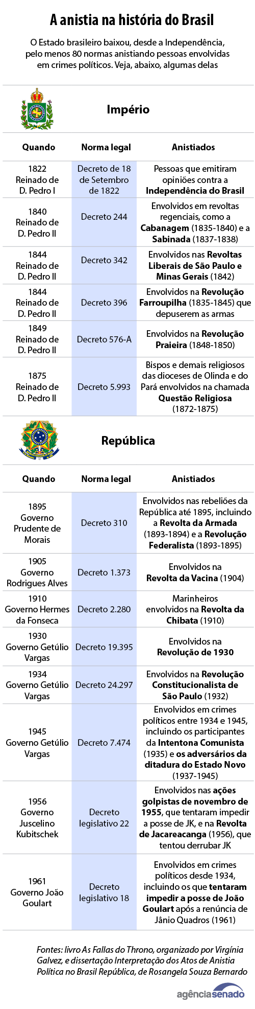 Os tempos do Império contabilizaram em torno de 20 anistias políticas. A maioria delas foi concedida entre 1831 e 1845, beneficiando os insurgentes das mais de 20 revoltas regenciais, entre as quais a Sabinada (1837-1838), na Bahia, e a Balaiada (1838-1841), no Maranhão.