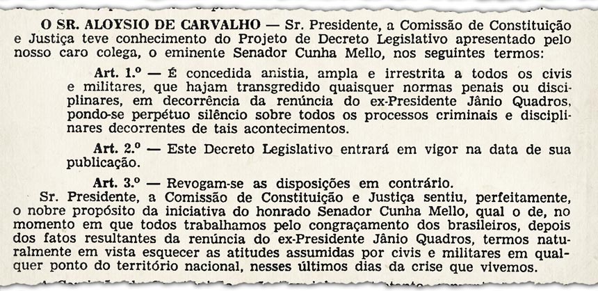 Em setembro de 1961, o senador Cunha Mello (PTB-AM) apresentou um projeto de anistia dos envolvidos numa tentativa de golpe de Estado ocorrida poucos dias antes. Os principais anistiados seriam os três chefes das Forças Armadas.
