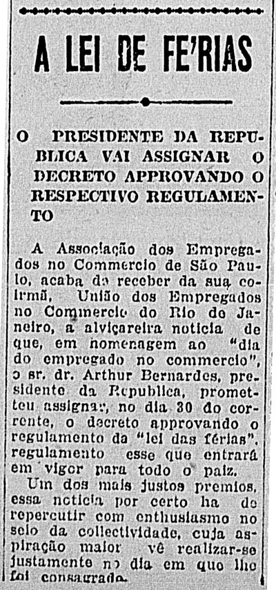 O jornal O País noticiou que, nas primeiras reuniões do Conselho Nacional do Trabalho destinadas a elaborar a regulamentação da Lei de Férias, “a intransigência de alguns oradores [representantes dos patrões] deixou transparecer certa animosidade contra a concessão de férias a empregados”.