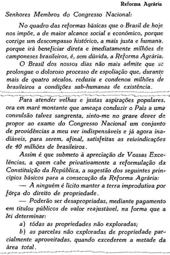 Na mensagem presidencial que enviou ao Congresso Nacional em 1964, Jango advertiu que, caso os latifúndios improdutivos não fossem desapropriados, divididos e entregues aos camponeses sem terra, o Brasil poderia submergir numa “convulsão talvez sangrenta”.
