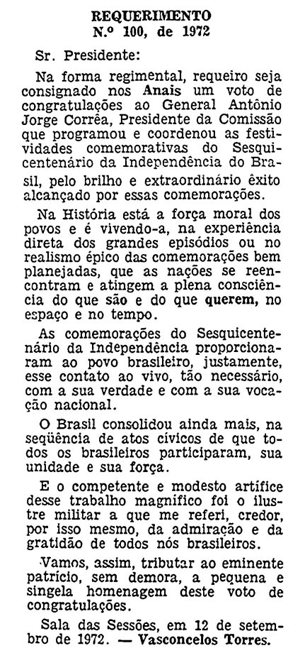 — Aproxima-se o mês de setembro, quando os festejos chegarão ao clímax. Seria o momento de convidar a essa comunhão cívica figuras representativas de Portugal, os intelectuais, os estudantes, os trabalhadores. Endereçamos um apelo à Transportes Aéreos Portugueses [TAP] no sentido de patrocinarem a viagem de uma delegação das classes representativas da gente lusitana ao nosso país. Tenho certeza de que o engenheiro Vaz Pinto, presidente da TAP, com o desprendimento cívico e a estima que vota ao Brasil , encontrará meios para essa rápida mobilização.