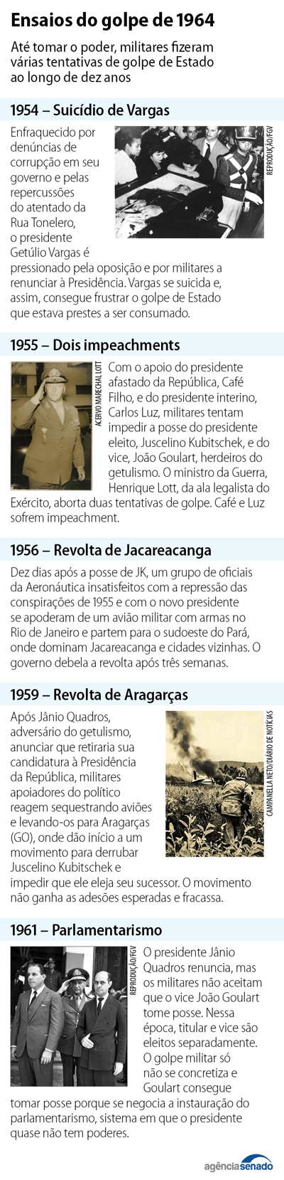 — Todas essas tentativas frustradas foram embriões do golpe militar de 1964, em que as forças antigetulistas enfim conseguiram tomar o poder e instaurar uma ditadura.