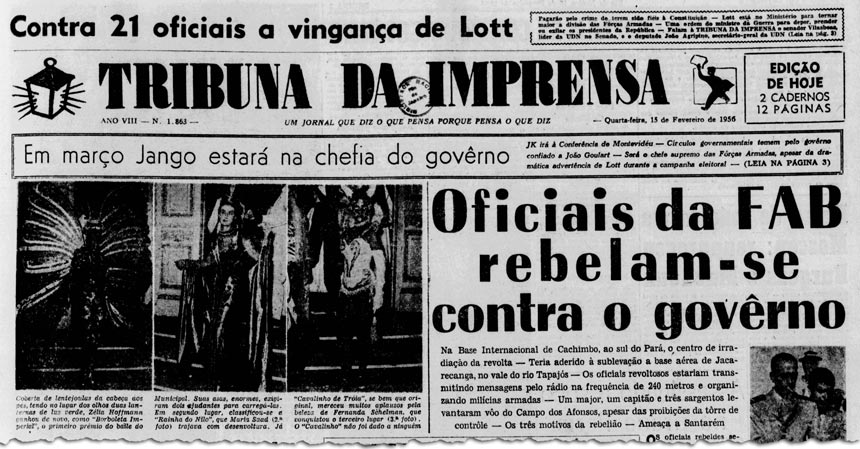 O presidente JK tomou posse em 31 de janeiro de 1956, e a Revolta de Jacareacanga estourou poucos dias depois, na noite de 10 de fevereiro. Naquela sexta-feira de Carnaval, dois aviadores — Veloso e o capitão José Lameirão — roubaram um avião militar carregado de armas do Campo dos Afonsos, uma base da Aeronáutica no Rio de Janeiro, e voaram rumo à Amazônia.