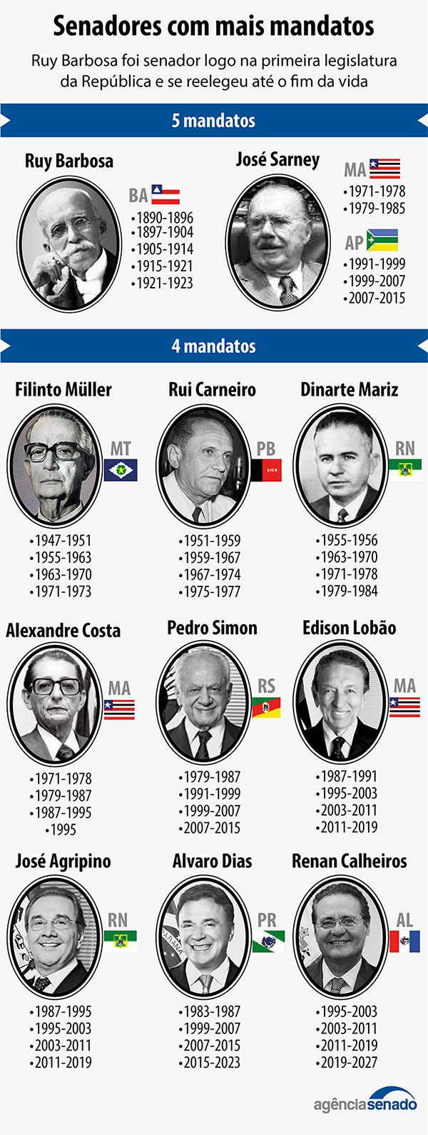 De seus 55 anos de vida pública, Ruy Barbosa passou 32 no Senado. Foi recordista de mandatos. Inaugurou o Senado da República, em 1890, e só o deixou em 1923, quando morreu, aos 72 anos de idade. Antes, no Império, havia sido deputado provincial e deputado geral.