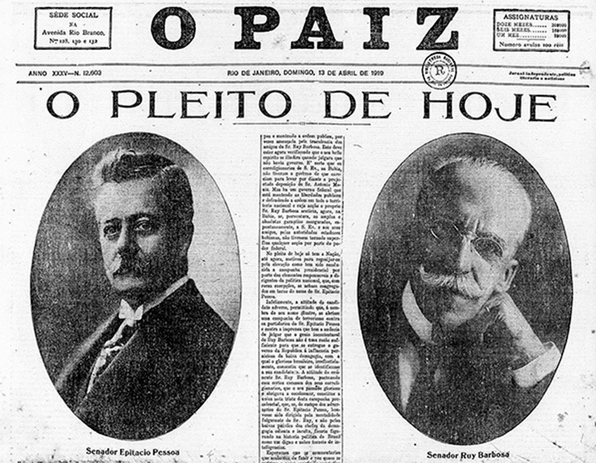 Na eleição de 100 anos atrás, Epitacio ficou com 71% dos votos. Ruy, com 29%.