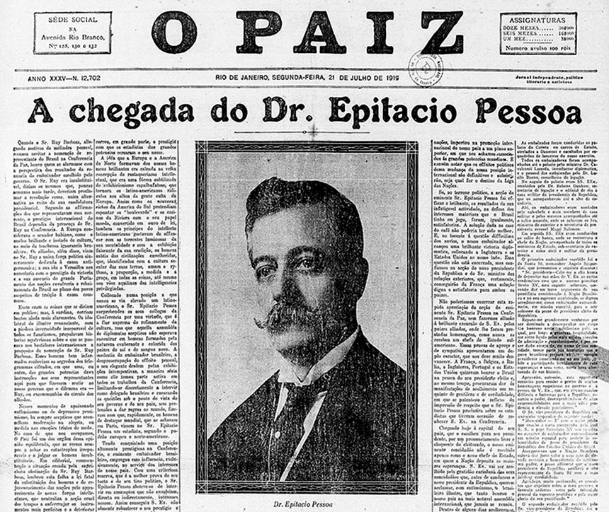 Epitacio não estava na Europa a passeio. Ele era o chefe da delegação brasileira enviada à Conferência de Paz de Paris, na qual os países vitoriosos na Primeira Guerra Mundial acertaram os termos de paz com os derrotados. O Brasil ganhou um assento no encontro por ter entrado no conflito ao lado dos aliados, ainda que apenas nos momentos finais e como um minúsculo coadjuvante.