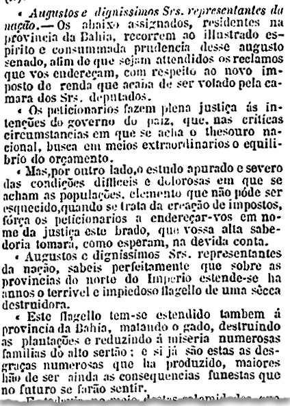 Na mesma época, um grupo de comerciantes da província da Bahia enviou aos senadores um abaixo-assinado implorando que não aprovassem esse tipo de imposto por ser “enormíssimo”, “vexatório” e “perigoso”. O senador José Bonifácio, o Moço (SP), acrescentou-lhe os adjetivos “desigual” e “desumano”.
