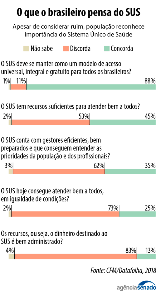 Em agosto, depois de seis anos, pesquisadores do IBGE voltaram a campo para perguntar aos brasileiros sobre seus problemas de saúde e sobre o atendimento no SUS. Sondagens menos amplas têm confirmado a visão negativa captada nos chamados protestos de junho de 2013: 55% dos entrevistados em 2018 pelo Instituto Datafolha, por demanda do Conselho Federal de Medicina (CFM), consideravam ruim a oferta em saúde, ainda que defendessem a manutenção do serviço (88%).