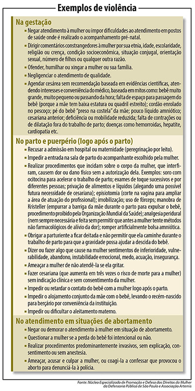 A lista de procedimentos inadequados (veja quadro ao lado) é grande e muitas mulheres nem sabem que podem considerá- -los violência. Há uma série de condutas que precisam estar muito fundamentadas para serem apresentadas como opção de atendimento, não podem ser rotina, explicou Valéria Sousa, diretora de Relações Legislativas da Artemis, organização que atua na defesa e promoção dos direitos das mulheres.