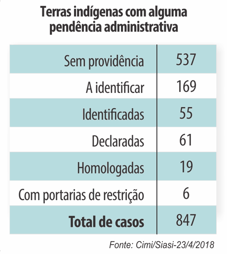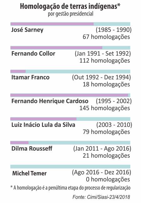 | 2017 | Parecer 001/2017 da Advocacia-Geral da União assinado pelo presidente Michel Temer | Marco temporal: os indígenas têm direito à terra desde que a área em questão estejam ocupadas até a promulgação da Constituição de 1988 |
