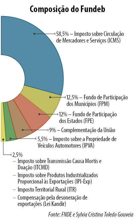 O Fundeb é a principal fonte de financiamento da educação básica (creche, pré-escola, ensino fundamental, ensino médio, educação de jovens e adultos, cursos profissionalizantes e educação especial, indígena e quilombola). Dos R$ 248 bilhões a serem injetados nas escolas públicas do país neste ano, R$ 156 bilhões sairão do fundo (65% do total).