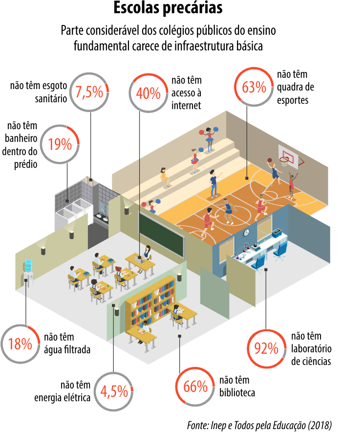 As verbas também se mostram insuficientes quando são listados os problemas que elas ainda não conseguiram resolver. A cada dez pré-escolas públicas, oito não contam com sala de leitura e sete não têm parquinho. No 3º ano do ensino fundamental, metade dos alunos não faz contas básicas nem lê de modo satisfatório. Dos adolescentes que deveriam estar cursando o ensino médio, 900 mil se encontram fora da escola. Insuficientes, as unidades de ensino de tempo integral só recebem 15% dos alunos da rede pública — a maior parte tem apenas quatro horas de aula por dia.