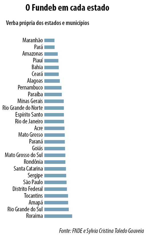 Desde 1998, o Brasil conta com uma sofisticada engrenagem contábil que impede que escolas pertencentes a estados e prefeituras pobres fiquem na penúria. Trata-se do Fundo de Manutenção e Desenvolvimento da Educação Básica (Fundeb), que recolhe verbas públicas e reparte o montante entre todas as 27 redes estaduais e 5.570 redes municipais de ensino.