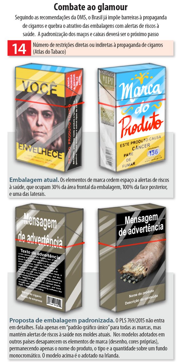 As medidas mais rigorosas estão reunidas no PLS 769/2015, do senador José Serra. O texto ataca o problema em quatro frentes distintas: proíbe qualquer tipo de exposição ou promoção de produtos fumígenos; prevê o uso de embalagens padronizadas para todas as marcas vendidas no Brasil; barra o comércio e a importação de cigarros mentolados ou aromatizados; e pune o motorista que fumar ou permitir o fumo em veículo que transporte menor de 18 anos.