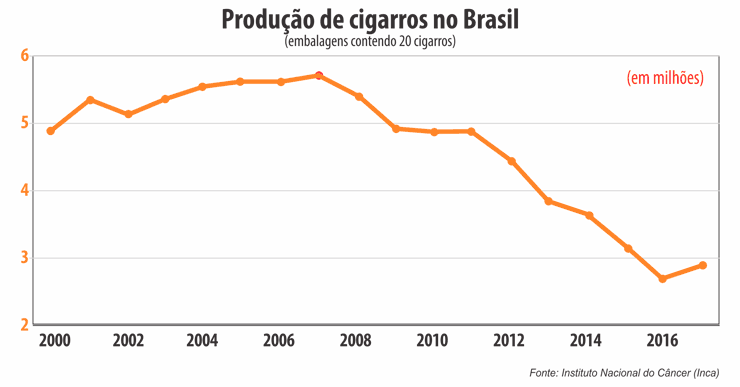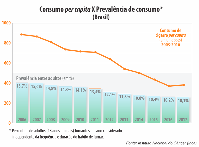 O argumento baseado nos efeitos nocivos do rigor tributário integra há muitos anos a pauta de queixas da indústria do tabaco — lado a lado com o do suposto equívoco quanto ao preço mínimo por maço (R$ 5,00). Ao longo das duas últimas décadas, entretanto, o hábito de fumar vem regredindo de maneira consistente. Entre 2003 e 2017, o consumo per capta caiu 57,8% e o número de fumantes, 35,6%, segundo o Instituto Nacional do Câncer (Inca).