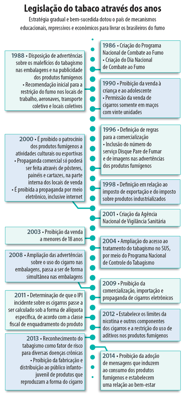O cigarro faz do Brasil refém de uma estatística perversa. De cada cinco jovens que dão a primeira tragada antes dos 18 anos, três podem ser tornar dependentes e permanecer fumando ao longo da vida adulta. O impacto para a saúde é desastroso: o uso continuado do tabaco está relacionado a pelo menos 50 enfermidades graves, como cânceres e doenças respiratórias e cardiovasculares. A droga mata mais de 156 mil pessoas por ano no Brasil 01— uma média de 428 óbitos por dia.