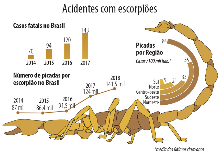 No Brasil, os escorpiões estão entre os animais peçonhentos que se beneficiam do calor. As ocorrências de picadas de escorpião aumentaram em mais de 60% desde 2014, segundo o Ministério da Saúde, passando de 87 mil a quase 142 mil. Já as mortes em decorrência das picadas cresceram 104% entre 2014 e 2017. O que muitos especialistas observam é que o escorpião prolifera mais no calor e na umidade, além de se beneficiar do aumento de baratas que crescem em meio ao excesso de entulho e lixo, males comuns nas zonas urbanas brasileiras.