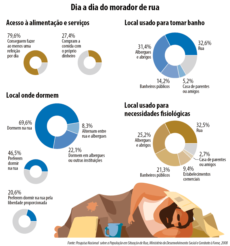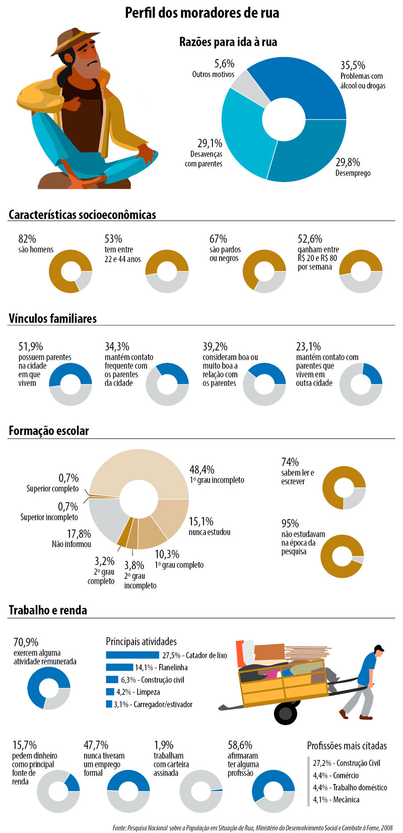 Graças a esse estudo, foi possível traçar um perfil heterogêneo da população de rua levando em conta idade, gênero, cor da pele, formação escolar, razões da ida para rua. Constatou-se, entre outros aspectos, que 69,6% deles dormem na rua, 22,1% em albergues e 8,3% alternam entre a rua e os albergues. Quanto à alimentação, 79,6% conseguem fazer pelo menos uma refeição por dia, mas apenas 27,4% compram comida com o próprio dinheiro.