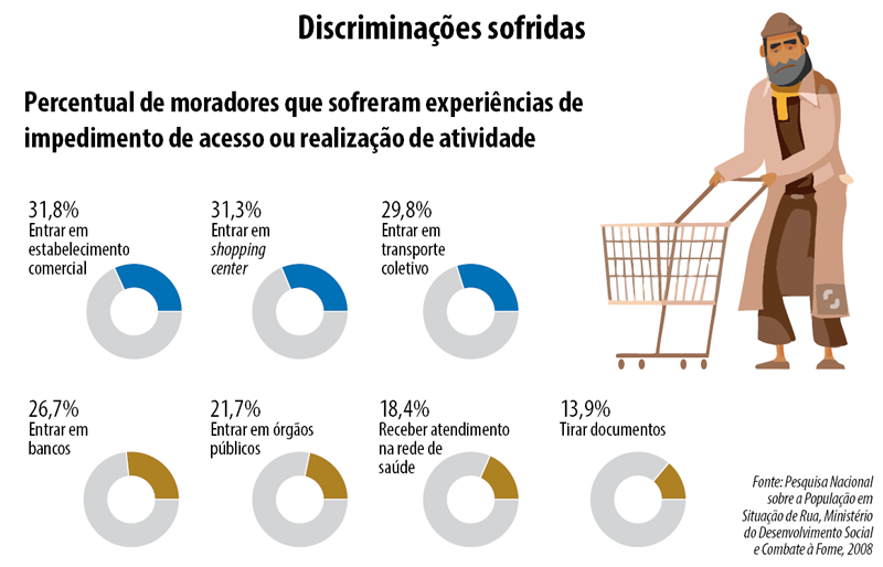 No ano passado o Disque 100, o aplicativo Proteja Brasil e a Ouvidoria do Ministério de Direitos Humanos (transformado agora em Ministério da Mulher, da Família e dos Direitos Humanos) contabilizaram aproximadamente 900 denúncias da população em situação de rua. No balanço divulgado com os tipos de violência de janeiro a junho, destacam-se os números de negligência (76,1%), violência psicológica (21,7%), violência institucional (19,2%) e violência física (11,4%).