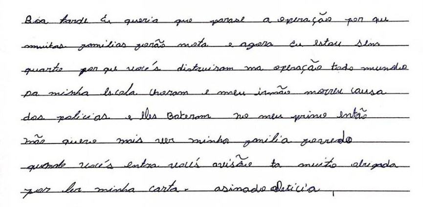 Você não tem como controlar uma entrada, uma impulsão dentro de uma comunidade com 50 policiais, com 20 policiais. Imagina aí como você faz. Por mais que você tenha tática, por mais que você tenha treinamento, na hora que abre fogo, é fogo à vontade. Ninguém vê em quem está atirando praticamente.