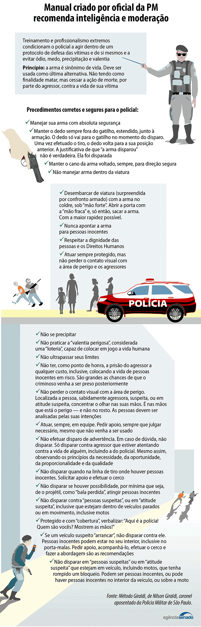 O caminho a ser perseguido é o de profissionalização do policiamento — e não afrouxamento das regras que vão conduzir esse processo, quando isso se tornar uma investigação, uma apuração. Aqui em São Paulo, temos o método Giraldi, chamado assim por conta do coronel que o criou, inspirado em práticas de policiamentos internacionais, [que orienta a instituição a] treinar exaustivamente seu policial em determinadas situações, para que a resposta dele já esteja em grande medida padronizada para atuar em contextos de alto nível de risco, estresse e vulnerabilidade, tentando controlar ou diminuir a influência dessas emoções.