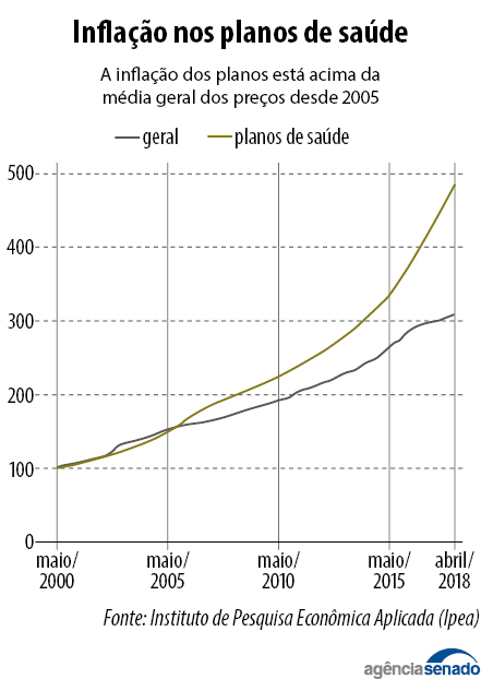 A chamada inflação dos planos de saúde é maior que a inflação geral desde 2005. Na avaliação do consultor Marcos Paulo Eirado, isso ocorre porque o setor inova muito e sempre aparecem medicamentos e tecnologias com preços mais altos.