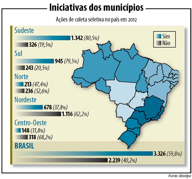 De acordo com a pesquisa da Abrelpe, quase 60% dos municípios brasileiros (veja mapa) já têm ações para promover a coleta seletiva de lixo. Mas a maioria delas se resume à disponibilização de pontos de entrega voluntária ou a convênio com cooperativas de catadores, iniciativas que não fornecem condições para aproveitar todo o potencial de reciclagem dos resíduos sólidos.