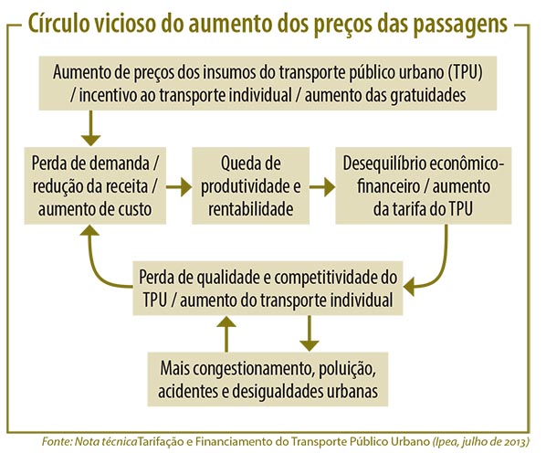 Uma delas, conforme o documento, está relacionada à perda de demanda pagante no sistema devido ao aumento do custo da passagem. A nota técnica acrescenta: “Quando esse fato ocorre, e na última dé- cada no Brasil verificou-se esse movimento em função do avanço do transporte individual, o nível da tarifa torna-se cada vez mais alto para compensar a diminuição do número de tarifas pagas, o que induz novas perdas de demanda, retroalimentando o círculo vicioso que se forma em função da dependência das camadas mais carentes da população em relação ao TPU e sua baixa capacidade de pagamento”.