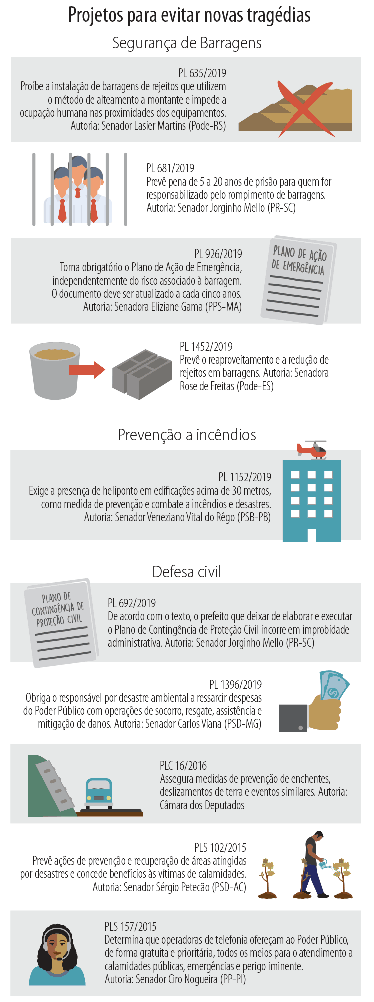 O Senado analisa pelo menos dez projetos de lei que pretendem evitar ou atenuar a ocorrência de novas tragédias. O PL 635/2019, do senador Lasier Martins (Pode-RS), proíbe a instalação de barragens de alteamento a montante — como as de Mariana e Brumadinho. O texto também impede a ocupação humana perto das represas. Já o PL 926/2019, da senadora Eliziane Gama (Cidadania-MA), obriga as mineradoras a apresentarem um plano de emergência, independentemente do grau de risco da barragem.