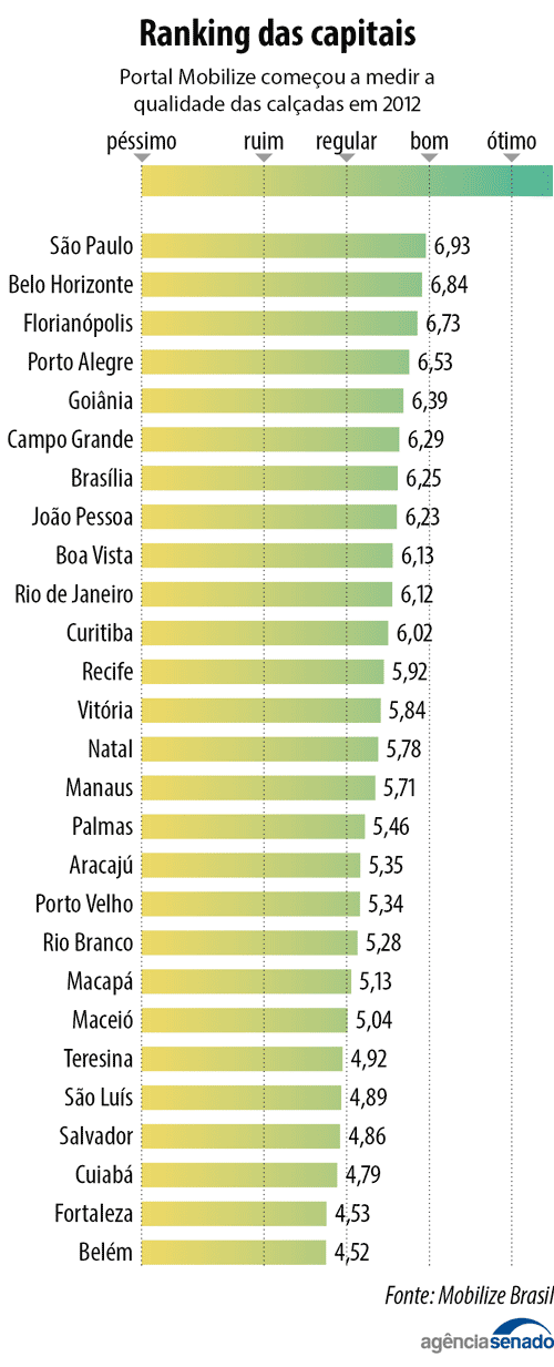 A média da caminhabilidade foi obtida a partir de 835 avaliações a cargo de voluntários da campanha Calçadas do Brasil 2019, realizada pelo portal Mobilize Brasil. Idealizado com o objetivo de produzir dados concretos sobre o que já estava evidente — por meio da observação e da experiência — o levantamento se baseou em quatro aspectos principais: acessibilidade, sinalização, conforto e segurança em passeios sob responsabilidade direta do setor público.