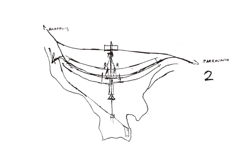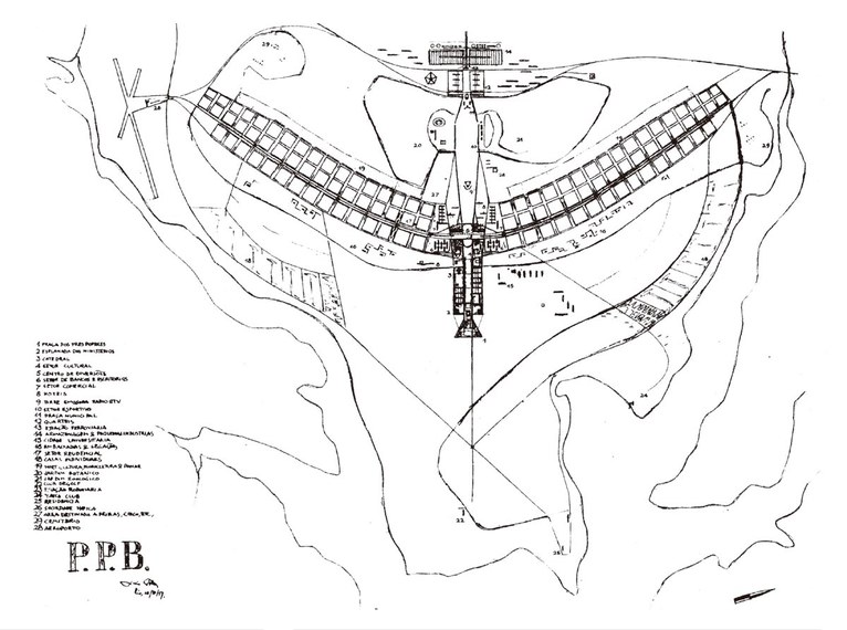 O cruzamento dos eixos, sendo o monumental reto e o rodoviário, arqueado, levou de fato muita gente a associar o desenho de Lucio Costa ao de um avião, mas essa não foi a intenção dele. O traçado, escreveu o urbanista em seu relatório ao júri do concurso, que tinha Niemeyer como um dos jurados, “nasceu do gesto primário de quem assinala um lugar ou dele toma posse: dois eixos cruzando-se em ângulo reto, ou seja, o próprio sinal da cruz”.