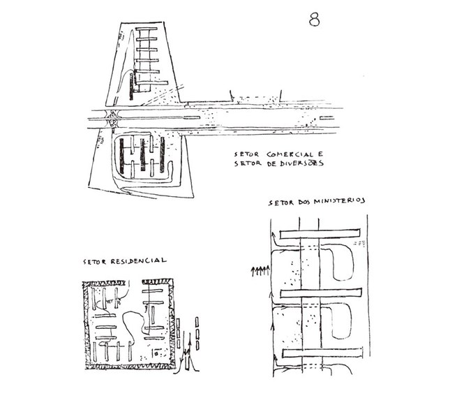 “Dia ‘histórico’ para mim foi aquele em que Lucio me apareceu, discreto como sempre, botando em minha mesa uma folha de papel rabiscada às pressas, com palavras e um esboço de desenho que aparentemente pouco significavam. Peguei a folha e tive entre os dedos nada menos do que a cidade de Brasília, inexistente e completa, como um germe contém e resume a vida de um homem, uma árvore, uma civilização. A primeira noção de uma cidade diferente de todas as outras até então imaginadas mostrava-se ali, nos traços rudimentares de uma cruz (ou um avião) plantada na terra ou alçando voo. O plano-piloto de Lucio dizia bem pouco para um leigo habituado a ver cidades em funcionamento e não no papel, um papel nada luxuoso como o dos grandes escritórios de arquitetura. Falei em rabisco e pulsava. Sem entender, eu sentia a vibração das formas implícitas naquela folha de papel que mudava a história do Governo do Brasil e, em certa escala, a vida dos brasileiros. Comovi-me. Lucio também devia estar comovido por ter achado a solução quase mágica para o problema de conceber uma Capital de País em termos absolutamente originais”. (Carlos Drummond de Andrade, em crônica publicada no Jornal do Brasil no dia 3 de março de 1982)