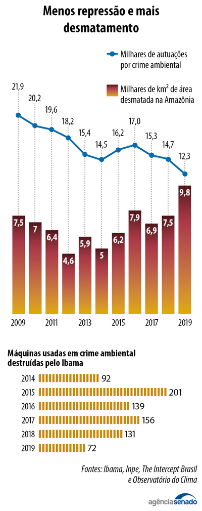 A área desmatada em 2019 na Amazônia, a maior floresta tropical do planeta, foi 30% superior à destruída em 2018. No mesmo período, o número de autuações por crime ambiental no país caiu 20%. Esses são dados do primeiro ano de governo do presidente Jair Bolsonaro, que tomou posse em janeiro de 2019. De acordo com analistas do setor ambiental, já é certo que, em razão do ritmo atual, os índices de desmatamento na Amazônia vão aumentar em 2020 na comparação com 2019.
