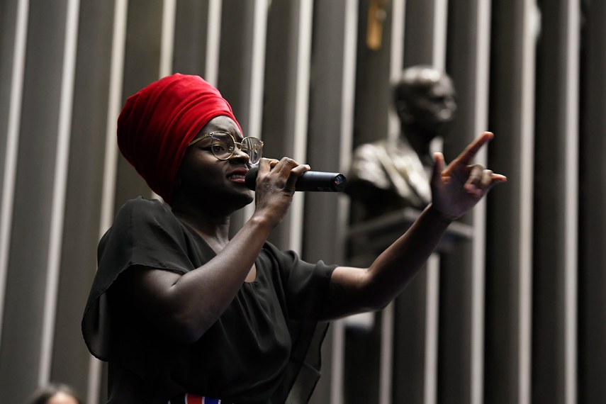 Senadores e convidados se reuniram em sessão especial, no dia 22 de novembro de 2019 para celebrar o Dia Nacional da Consciência Negra. O combate ao racismo e à discriminação, a preocupação com o alto índice de homicídio da população negra no Brasil e a sua inserção no mercado de trabalho foram as principais preocupações dos participantes. Na imagem, a cantora Rebeca Realezza se apresenta no Plenário.