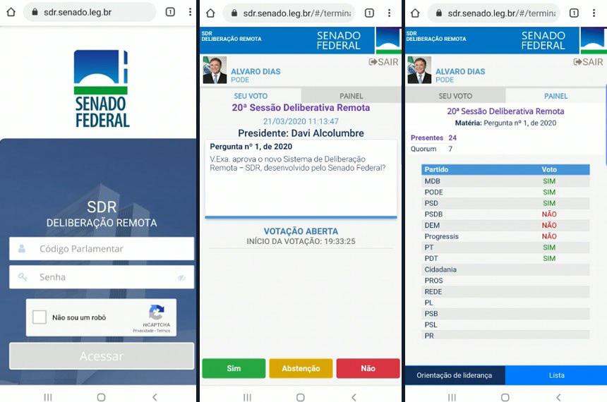 O Sistema de Deliberação Remota (SDR), compreendendo os mecanismos de debate e votação e o apoio técnico do Prodasen, ganhou uma certidão de nascimento na terça-feira, dia 17, na forma de um Ato da Comissão Diretora. O respaldo oficial era imprescindível. Segundo o Regimento Interno, em casos emergenciais o Senado pode se reunir “em qualquer outro local”, mas não estava imediatamente claro que esse local poderia ser a rede mundial de computadores.