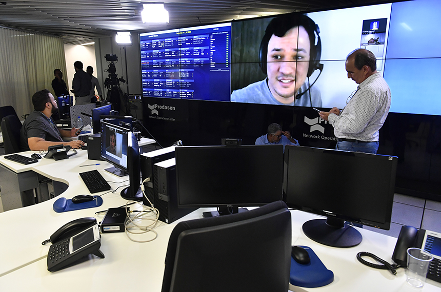 É na parede reta oposta à janela que está a peça principal do NOC: um enorme painel eletrônico, composto por 14 telas de 55 polegadas. Nele são exibidos os alertas aos quais os técnicos do Prodasen têm que ficar atentos, entre falhas de conexão e ameaças de invasão à rede.