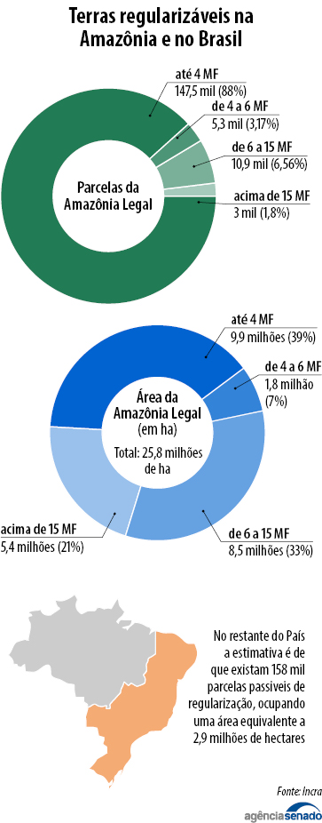 Números fornecidos pelo Incra indicam que há 25,8 milhões de hectares de terras regularizáveis na Amazônia Legal, em 166,9 mil parcelas, sendo 147 mil delas em terras com até quatro módulos fiscais, 39% do total. As 3,7 mil parcelas de terras maiores que 15 módulos fiscais equivalem a 21% da área. No restante do país a estimativa é de que existam 158 mil parcelas passiveis de regularização, ocupando uma área equivalente a 2,9 milhões de hectares.