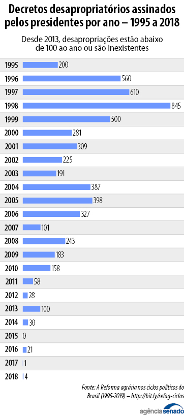 A política de assentamentos a partir de desapropriações, iniciada no governo Sarney, teve desdobramentos nas administrações de Fernando Collor, Itamar Franco, Fernando Henrique, Lula e Dilma, mas diminuiu consideravelmente de ritmo no governo Temer. Depois de uma quase parada no período de grande instabilidade política e econômica a partir de 2015, a questão agrária vem sendo substituída nas prioridades governamentais pela regularização fundiária, modelo por meio do qual se busca colocar na legalidade quem já está ocupando terras sem os devidos títulos.