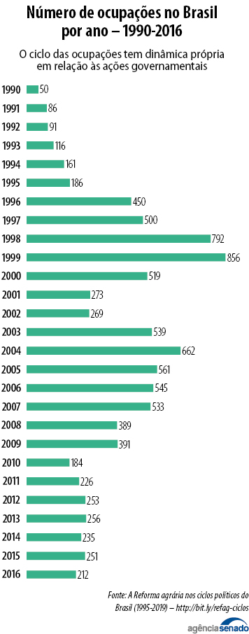 O levantamento das ocupações de terras dão conta de uma subida íngreme de 50 em 1990 para 856, em 1999, queda para 262 em 2002 e novamente uma elevação para marcar 662 em 2004, permanecendo nessa faixa, com movimento de queda até 391 em 2007, seguido de nova queda para 184 em 2010, subindo a 256 em 2013 e finalmente caindo a 212 em 2016.