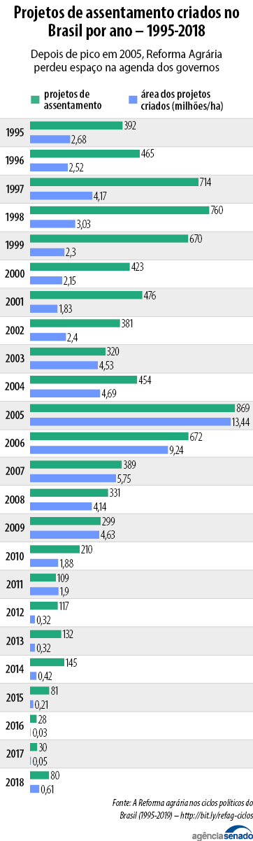 O número de famílias brasileiras assentadas sofreu queda de mais de 85% nos últimos anos. De 26.335 famílias assentadas em 2015, para 3,8 mil em 2020, com apenas 1,2 mil em 2017. Os projetos de assentamentos criados no Brasil também sofreram redução. Em 2005, foram 869 projetos de assentamento. Já em 2016, não passaram de 28, o menor número desde 1995.