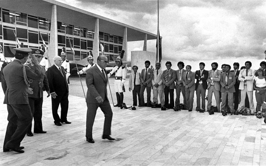 Ao fundo, da esquerda para a direita: Moreira Mariz, Antônio Dorgivan, Adão Nascimento, Cláudio Alves, Sérgio Marques, Julio Fernandes Francisco Gualberto, Sérgio Borges, Beth Cruz, Élder Miranda e Vicente Fonseca, o Gaúcho. Em primeiro plano: presidente João Figueiredo e Leitão de Abreu, ministro-chefe do Gabinete Civil. Foto: J. França