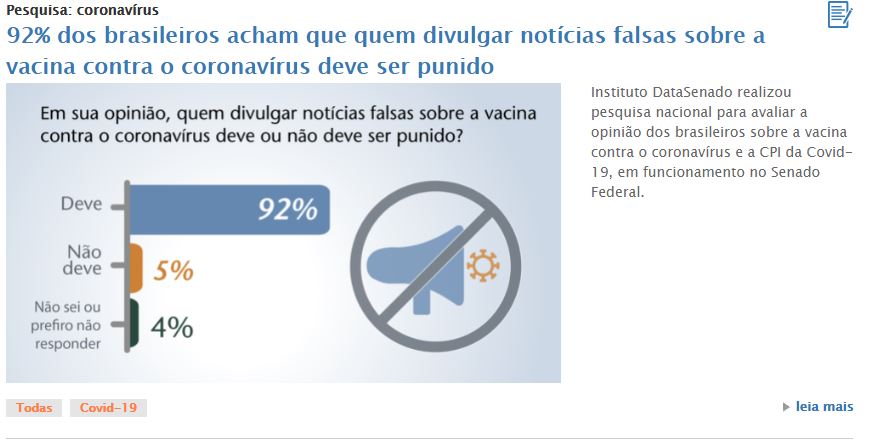 A pandemia, ao puxar mais o olhar dos parlamentares para as vulnerabilidades sociais — conforme disse o senador Paulo Paim — também afetou o tipo de orientação que eles pediram ao DataSenado. O instituto, que faz cerca de 20 pesquisas de temas variados por ano, realizou, em 2020, 12 só sobre a pandemia. Entre os temas explorados: se os brasileiros têm plano de saúde; quantas pessoas achavam que já haviam contraído covid-19; como é a situação de conectividade doméstica dos estudantes. Temas relevantes para o momento e coincidentes com a situação do Senado, cujas votações estavam praticamente monotemáticas.