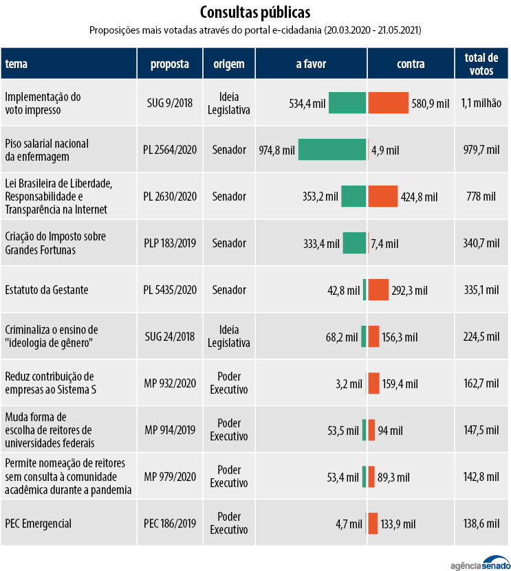 Essa ferramenta é a mais simples do portal, mas também a mais explorada: já foram mais de 20 milhões de votos em todas as proposições que tramitam pelo Senado. O caminho para aprimora-la passa pelo aprofundamento. Hoje o público pode apenas manifestar se gosta ou não do projeto como um todo, mas eventualmente poderá opinar sobre trechos específicos e detalhar suas críticas ou elogios.
