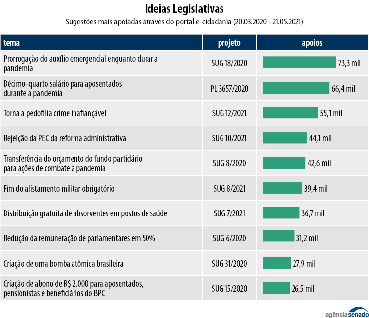 A ideia legislativa oferece uma alternativa facilitada para que os brasileiros vejam suas criações sendo discutidas no Congresso Nacional. Em nove anos de funcionamento do portal, cerca de 200 ideias tiveram o número suficiente de apoios para serem analisadas pela comissão, e elas geraram 27 projetos de lei. Para efeito de comparação, apenas cinco projetos de iniciativa popular conseguiram cumprir todas as barreiras burocráticas desde a promulgação da Constituição Federal, há mais de 30 anos.