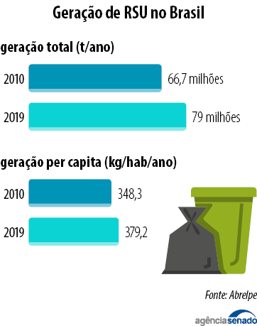 Esse aumento, que em 2010 motivou a criação da PNRS, manteve-se nos anos que se seguiram à implementação da lei. Segundo dados do Panorama dos Resíduos Sólidos no Brasil 2020, a geração saiu de 66,7 milhões de toneladas em 2010 para 79,1 milhões em 2019, uma diferença de 12,4 milhões de toneladas. O mesmo estudo diz ainda que cada brasileiro produz, em média, 379,2 kg de lixo por ano, o que corresponde a mais de 1 kg por dia. As informações foram coletadas e publicadas pela Associação Brasileira das Empresas de Limpeza Pública e Resíduos Especiais (Abrelpe).
