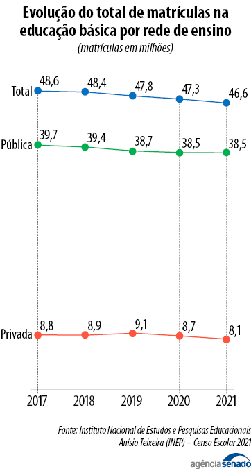 Conforme o mesmo censo, as matrículas, que já vinham numa trajetória de queda, passaram de 47,8 milhões, no total, em 2019, para 47,3 em 2020 e 46,6 no ano seguinte. A trajetória da perda no setor privado foi mais acentuada: os ingressos passaram de 9,1 milhões em 2019 a 8,7 milhões em 2020 e a 8,1 milhões em 2021. No setor público, eram 38,7 milhões em 2019 e se estabilizaram em 38,5 milhões a partir de 2020.